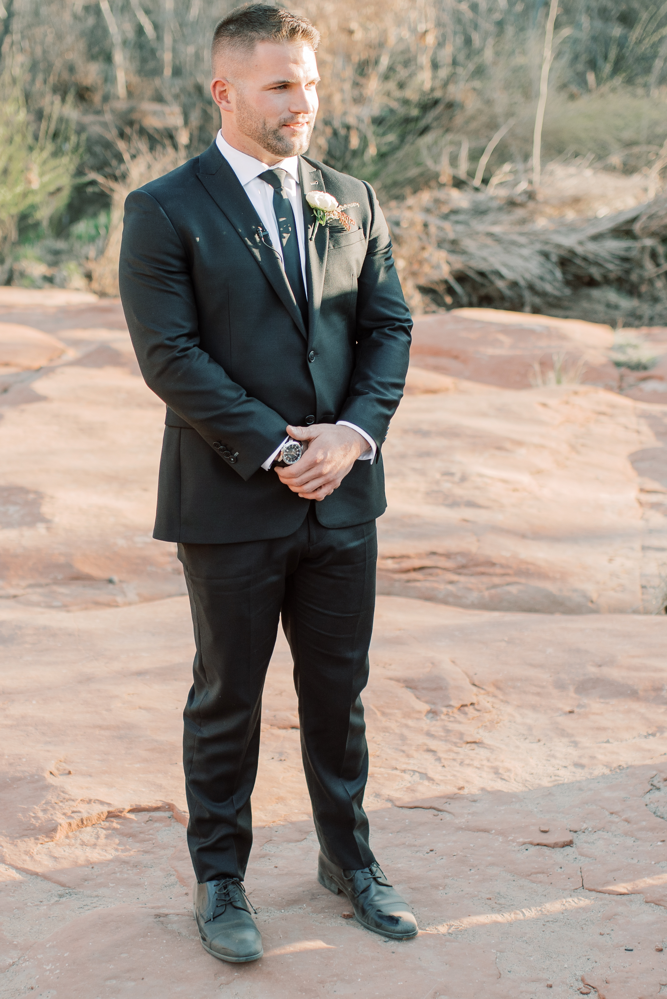 With the ceremony not taking place until sunset, we had time to play around and explore Sedona. I came across Cathedral Rock Trail during my research and after scoping it out I knew it was the PERFECT location for Kim & Nick’s romantic portraits. We were able to get right up close – in a short amount of time – without requiring a jeep rental or having to actually CLIMB on all fours! (More on climbing to the top of Cathedral Rock later, we did it the next day and it was CRAZY!) If you’re traveling through or if you’re getting married in Sedona, Cathedral Rock is a must stop!