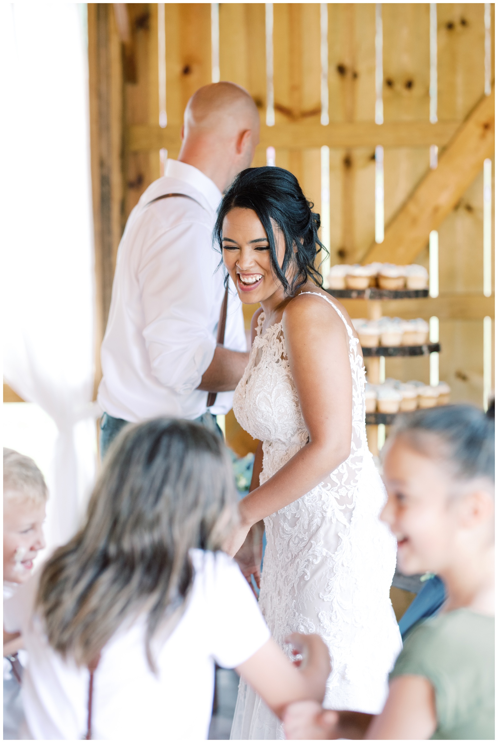 They got married in the pine tree grove, Bob’s children serving as best man and maid of honor. And afterwards guests took to the pavilion were they were treated to a Mexican buffet by Sweet Clarisse Catering (not gonna lie, I get super excited when my couples choose them & I get to eat more of their food :P), copper mule mug favors, cupcakes from Food Network Award Winning Bakery – Meringue Bakery, and shaved ice truck for dessert. And let’s not forget the kiddos! The little guests were also treated to their own kids table of lollipops & etcha sketches, and even a blow up trampoline, making sure EVERYONE had a great time. Soundtracks from their favorite Fantasy movies filled the pavilion as guests ate and enjoyed shelter from the hot sunny day. They used vintage books from Caitlin’s grandparent’s collection for decor and pages from Harry Potter novels served as their table runner underneath green garlands. The two newlyweds ended the night with a choreographed dance filled with flair, and guests joined in to help celebrate the new Mr. & Mrs, dancing the night away under the string lights. Such a magical day!