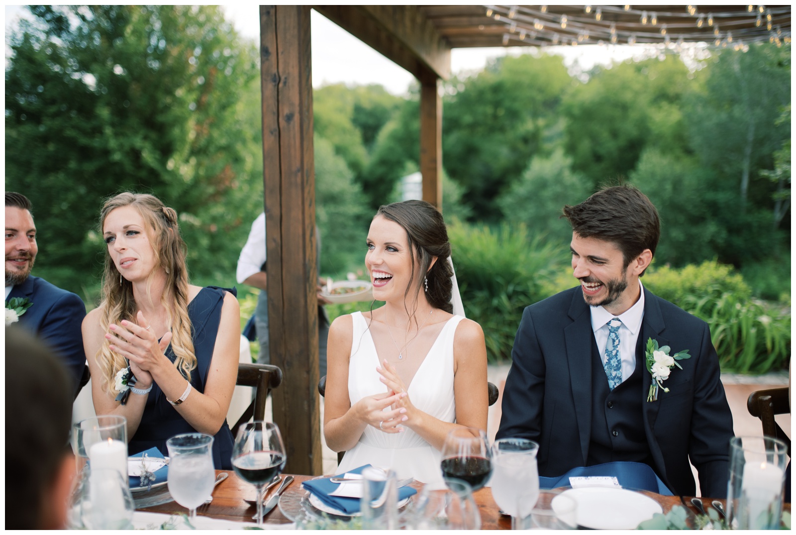 We met Emily at the Geneva Inn where she and the girls were getting ready prior to making their way to the cabin. Then together with 15 of their family and friends, they were married on Rudy’s family’s land. A secluded intimate setting, they exchanged vows under the big tree by the pond, and later enjoyed chef-prepared hor d’oeuvres and cocktails on the outdoor patio, a perfect for setting up an “al fresco” styled dinner. A long harvest table was decorated with a lush greenery eucalyptus runner on top of white linens and an abundance of pillar candles helped provide a cozy ambiance come twilight. They and their guests danced the night away underneath the tealights. And although in the end it was not the wedding day they had initially envisioned, seeing the joy expressed all day long, made it all feel so right.