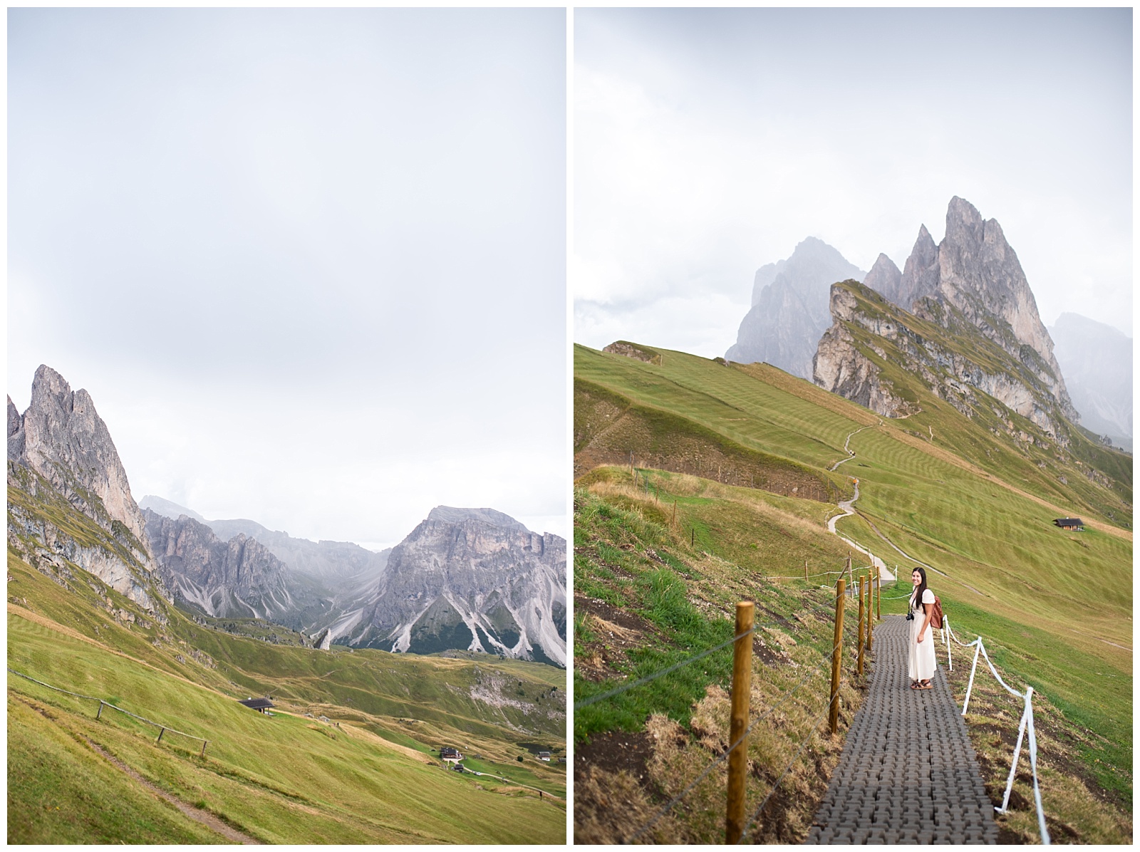 We chose this town next for it’s location to Seceda (the epic location I saw that first brought my attention to the Dolomites, a peak featuring a grassy green plateau that jets out towards the sky (if you’re lucky you will get the perfect amount of cloud immersion so it looks like the “ends of the earth” or heaven, or both)! In order to get to Seceda, you have to take a very vertical gondola up (or hike it, which unless you’re a serious hiker I would not recommend haha). It was a pretty penny to make the round trip up, I want to say $70 for the both of us. And the last trip up departed at 4:00 or so (which I didn’t realize so soon, as I had planned to go up for sunset photos)! It was approaching 4:00, and I saw the weather forecast would be iffy during our entire stay, but it looked like we might get a little break in the sky if we went NOW. So up we went!